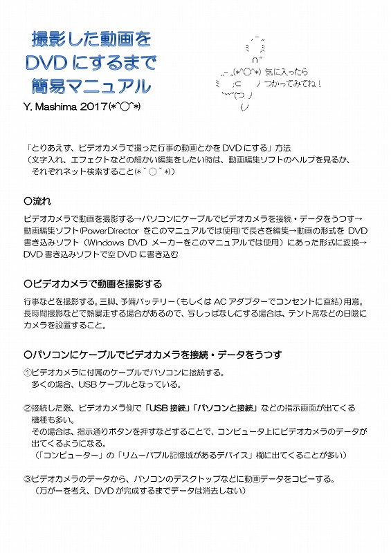 これは、「スマートフォンは使えるけどパソコンは正直よくわかんない」友人に向けて親切にも私が作ってあげた「撮影した動画をDVDにするまで簡易マニュアル」です。